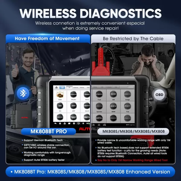 🏆【BT Version Of MK808S/ MX900/ MX808S/ MK808Z, More Practical】It's time to discard your wired tool and have a convenient wireless diagnostic tool! Autel MK808BT Pro makes your services repair easier, you can in/ around the vehicles. Compare to the out-of-date wired tools Autel MK808S MX808S MK808Z MX900, MK808BT Pro adds VCI Mini(valued 130Bu cks) with 10M range convenient wireless diagnosis but only 70US D more. Adopted German BT technology, ensures the safety & stablility of data transfer.