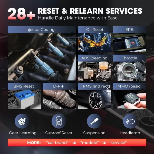🚗【28+ Reset & Relearn Services】As the 2023 upgraded version of MaxiCOM MK808 MX808 scanner, Autel MK808S has more tool-guided service functions accessible for your more-effective maintenance: not just Oil reset/SAS/EPB/BMS/DP-F/Throttle/ABS services, also newly-added SUS/ADBLUE/EGR/NOX/Headlamp resets.You can use these popular functions to recalibrate or configure components after making repairs or replacements. Note that this won't work on ALL cars. Message us to check the compatibility.
