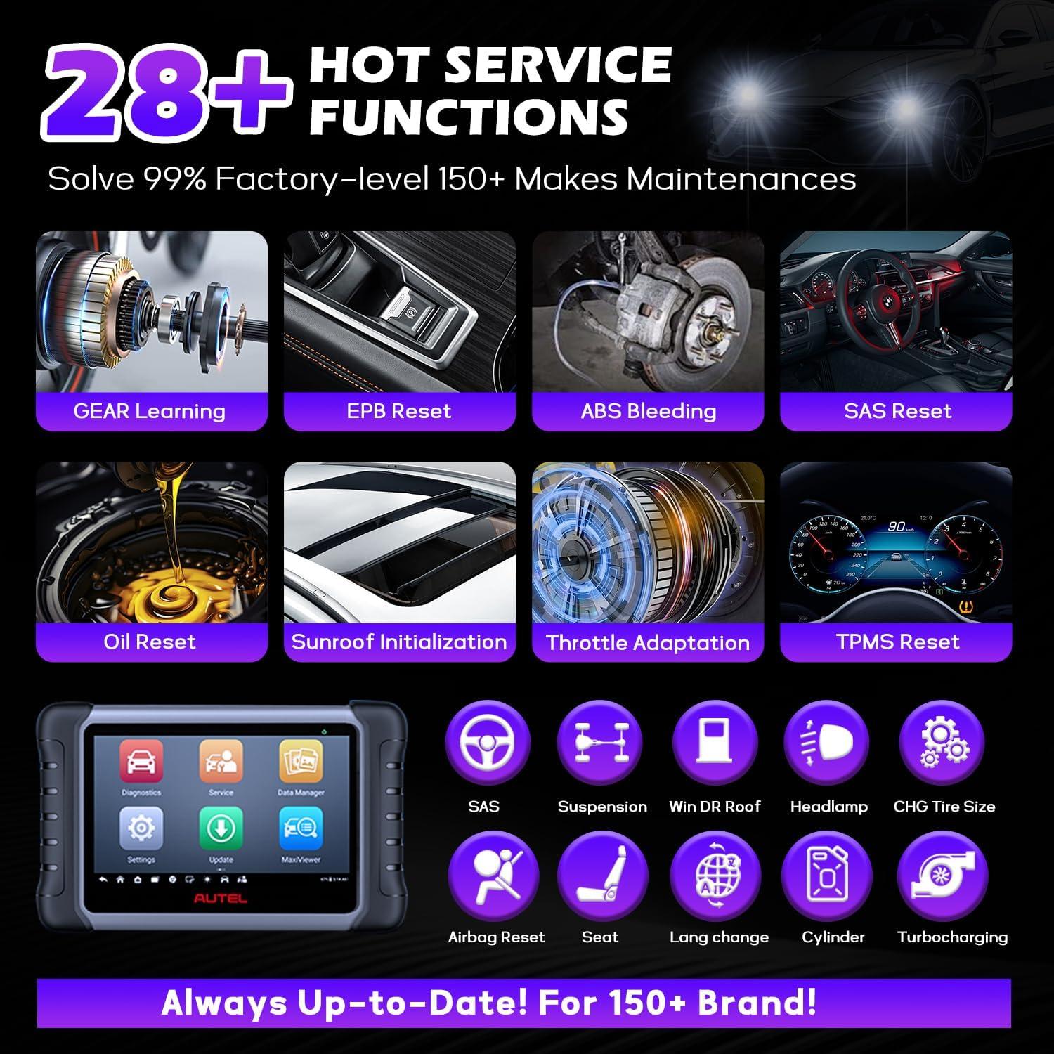 [28 + SERVICE&HOT FUNCTIONS] As a professional car diagnostic tool , Autel scanner MX808 provides 28+ service and hot function options including Oil Reset, EPB Reset, SAS Reset, Battery Registration, Throttle Reset, ABS Bleed, Injector Coding, Headlamp etc. Note: Service/Hot functions do NOT work on all cars. Please send VIN to obd2mart @ outlook . com to check compatibility.