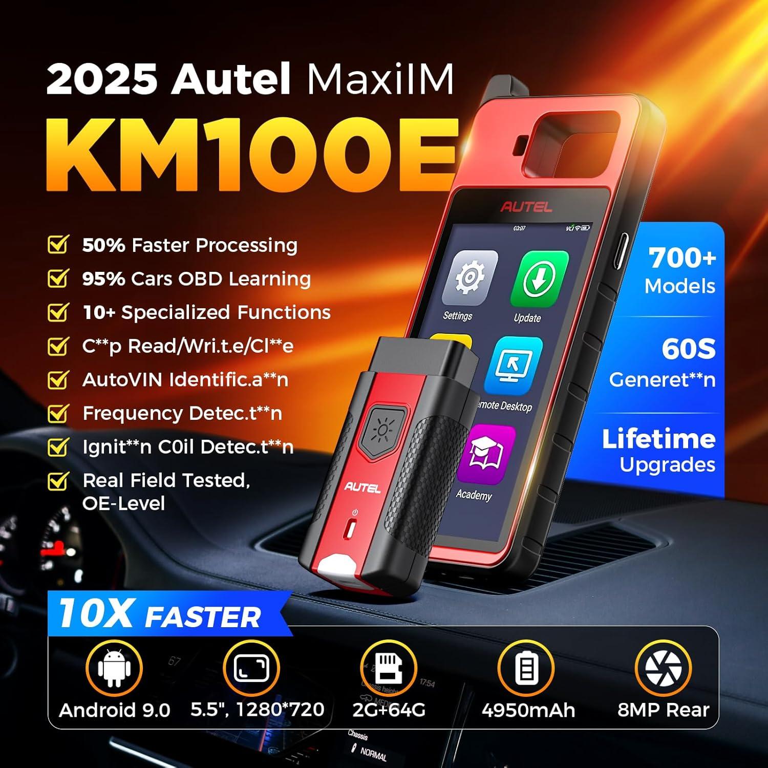 【5X-Faster Running, NO IP Limitation】Autel MaxiIM KM100E comes with flagship-level specs: √ Android 9.0+Rockchip PX30: Quick boot + smooth multitasking. √ 5.5” (1280*720) Screen: Clearer view √ 2GB+64GB: More storage space. √ 4950mAh Battery: Power for a full day’s work. >> NO IP limitation (NO features restriction). >> Multilingual Menu: English/ Spanish/ Portuguese (S/N to us for language switch). 100% original Autel scan tool: Lifelong Upgrades Included + 12-Month Quality Backup. Any issues? Reach to us, available at 24/7.