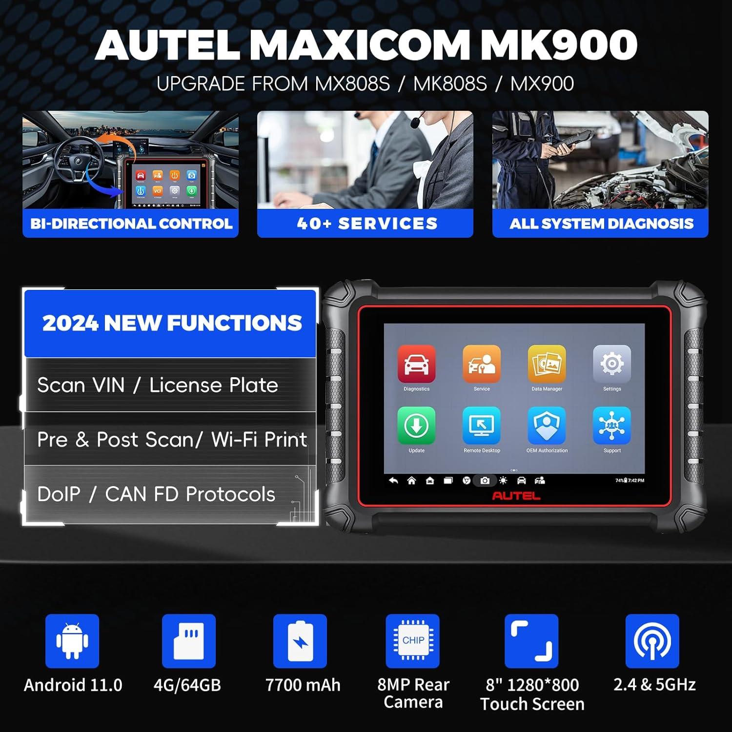 【Autel MX900, Upgrade of MK808S MX808S MK808BT】Autel MaxiCheck MX900 is an 8″ (1280×800), MX900 all-systems scanner is more advanced in hardwares: Android 11OS; 2.4 & 5.0 GHZ Dual WiFi; Expanded Storage : 4GB/64GB; Upgraded ROCKCHIP RK3566 Processor. All New Functions are accessible out of box with no need extra Updates. Bidirectional/ 3000+ Active Tests, 40+ Services, OEM Full System Diagnose, Battery Test (BT506), Endoscope Function.