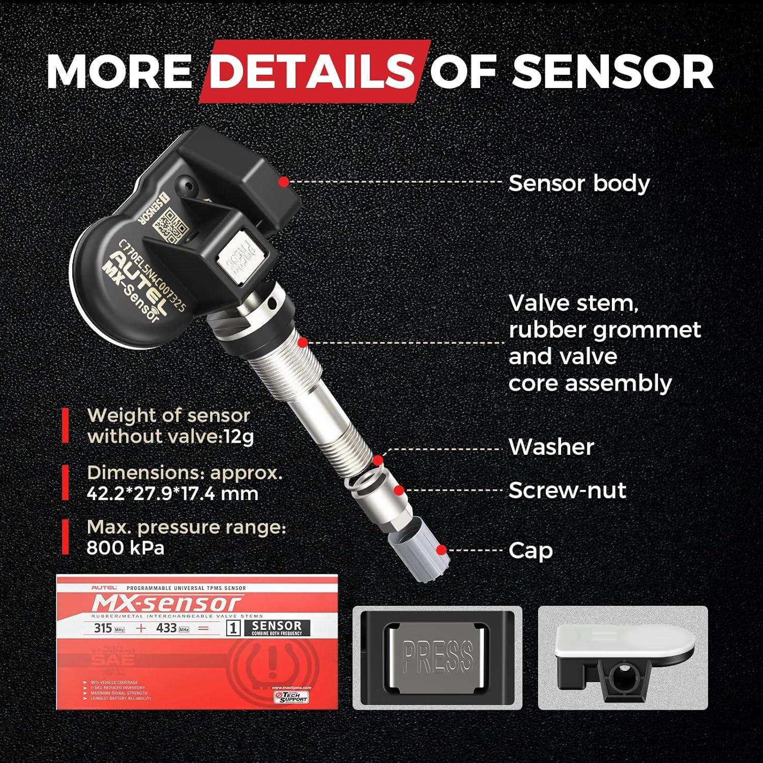 👍【DESIGNED FOR AUTEL TPMS PROGRAMMING TOOLS】 Autel TPMS replacement sensor MX-Sensor is designed for Autel TPMS Programming tools, it is programmable with TPMS products TS408S, TS508WF, TS601, ITS600, and diagnostic scan tools such as MK808S-TS, MP808S-TS, MP900-TS,MS906 Pro-TS etcs. When working with Autel programming tools, up to 20 MX-Sensors could be perfectly programmed at the same time, providing great convenience for replacing OE/Other sensors that are broken or with lower battery.
