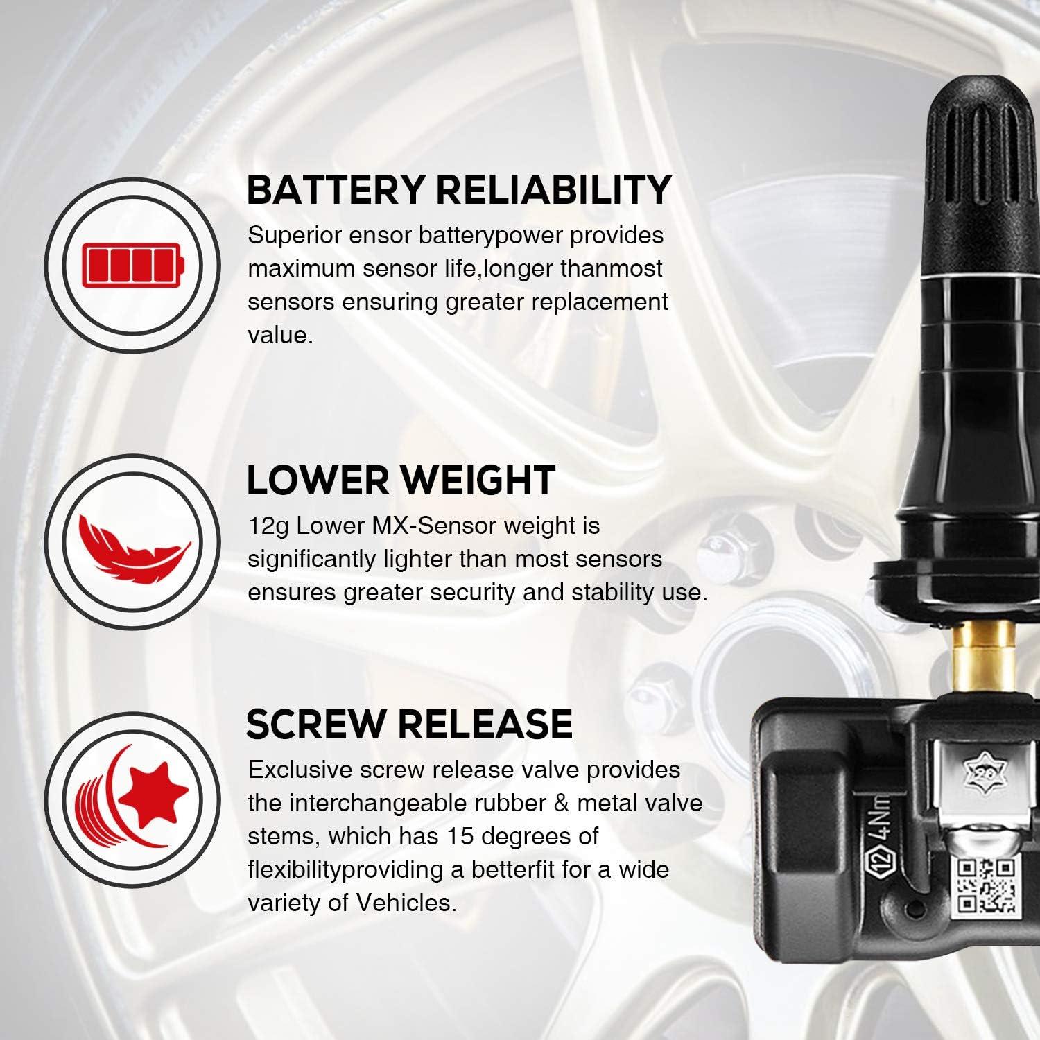 🚗【Upgraded Version Compared with Other General Tire Sensors】 The Autel new MX-Sensor with interchangeable rubber and metal valves to replace 98% of OE sensors with only 1-Sensor types. The exclusive 15°-30° Angle Adjustable design Screw-in rubber/matal valve to be interchangeable easily, which minimizes installation time and provides a quick and simple assembly. Only 11 gram weight light and superior battery power means it's more durable and longer than most sensors' life and replacement value.