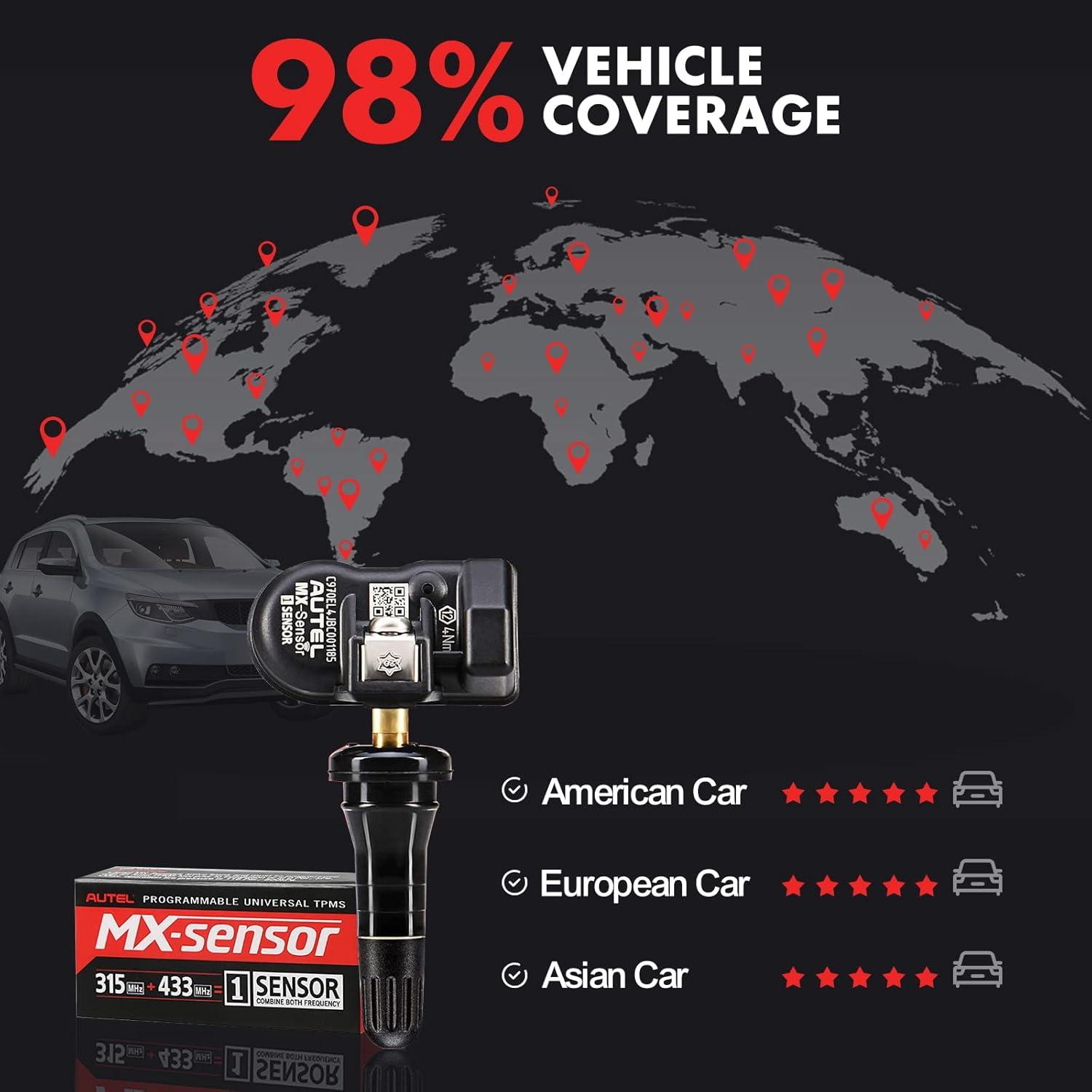 🚗【Tire Pressure Monitoring System Sensor combines 315MHz+433MHz Frequency】 Autel 2 in 1 MX-Sensor builds to match or exceed OEM sensors are 100% ID clone-able with no relearn required when it's cloned with original sensor ID and put in the same position, coverage the solution with 98% model vehicles from Autel wireless programming tool. Superior battery life and stability high performance for a period of 24 months or 24,000 miles. Guaranteed with SAE industry standard J1205/J1206 testing.