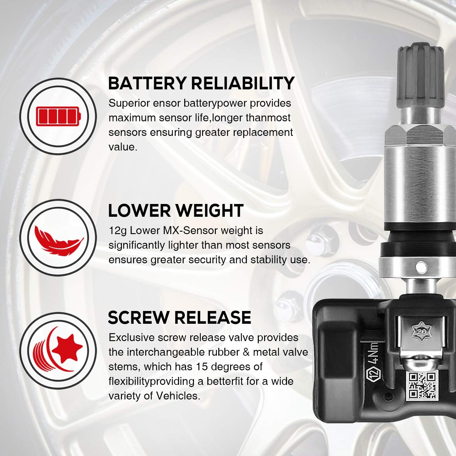 🚗【Upgraded Version Compared with Other General Tire Sensors】 The Autel new MX-Sensor with interchangeable rubber and metal valves to replace 98% of OE sensors with only 1-Sensor types. The exclusive 15°-30° Angle Adjustable design Screw-in rubber/matal valve to be interchangeable easily, which minimizes installation time and provides a quick and simple assembly. Only 11 gram weight light and superior battery power means it's more durable and longer than most sensors' life and replacement value.